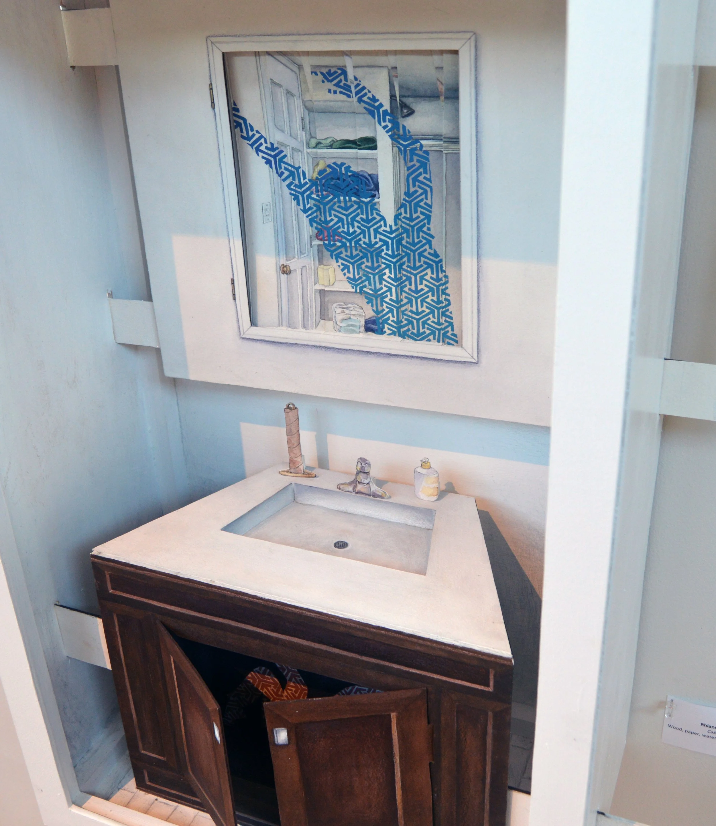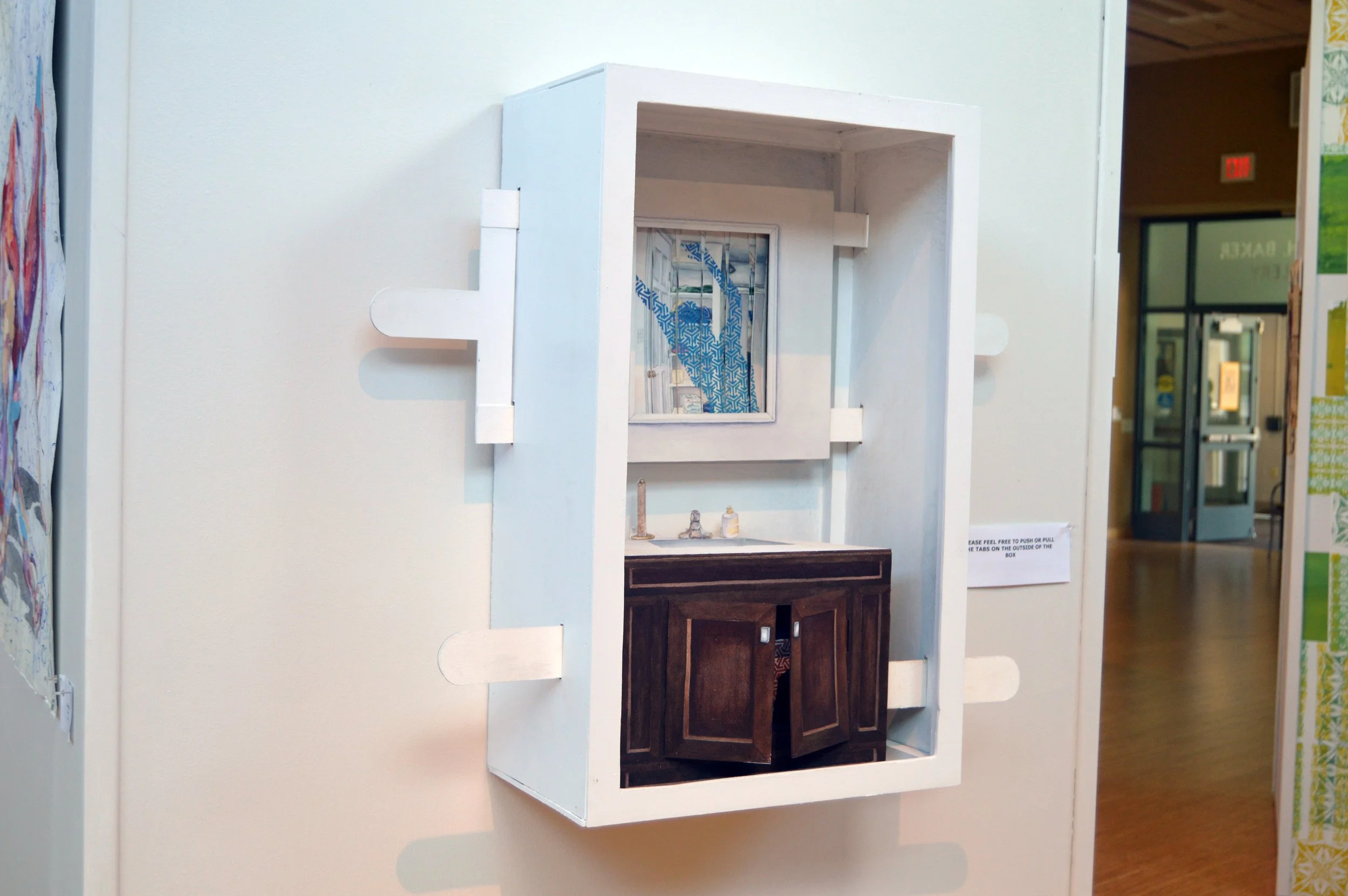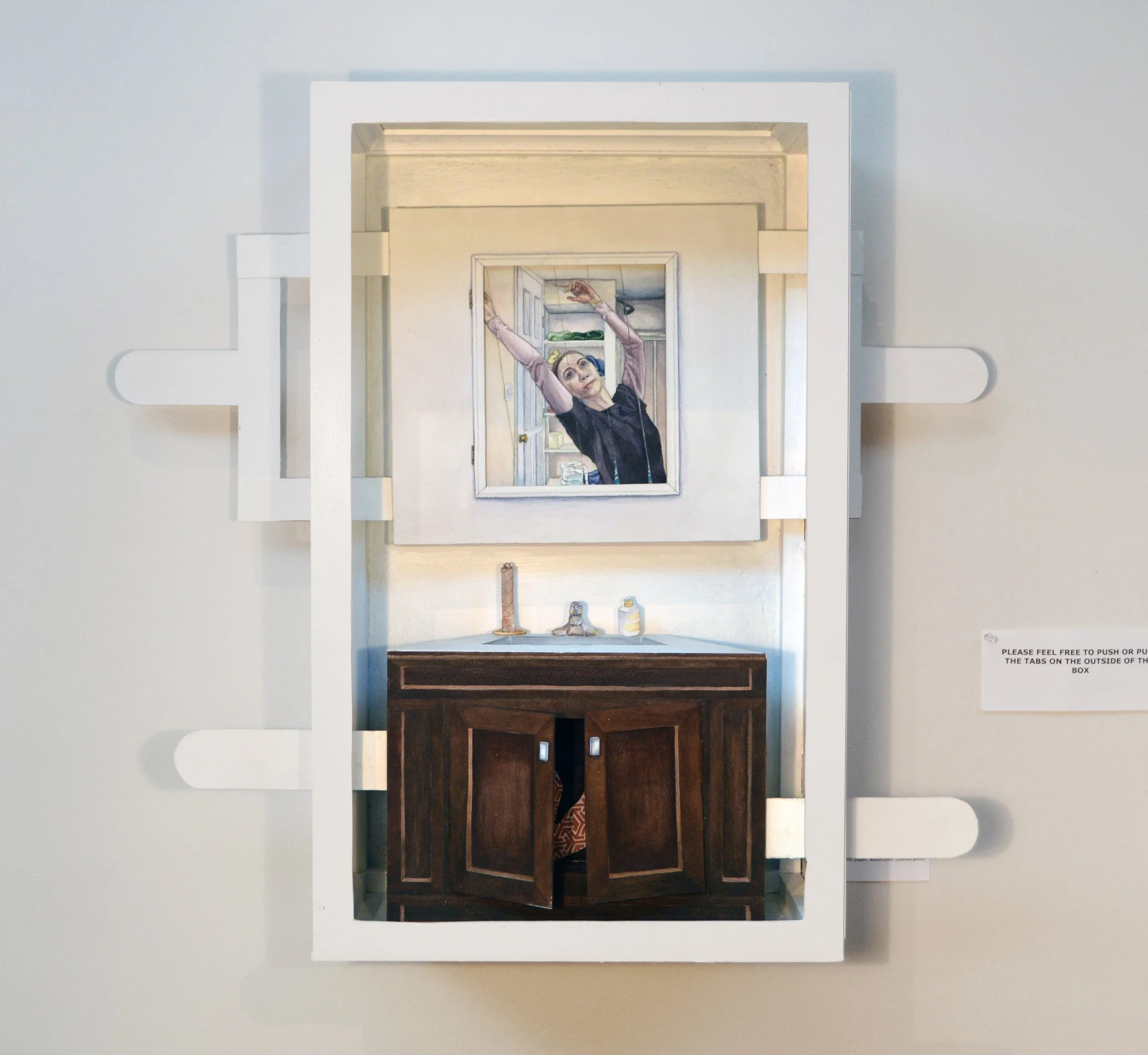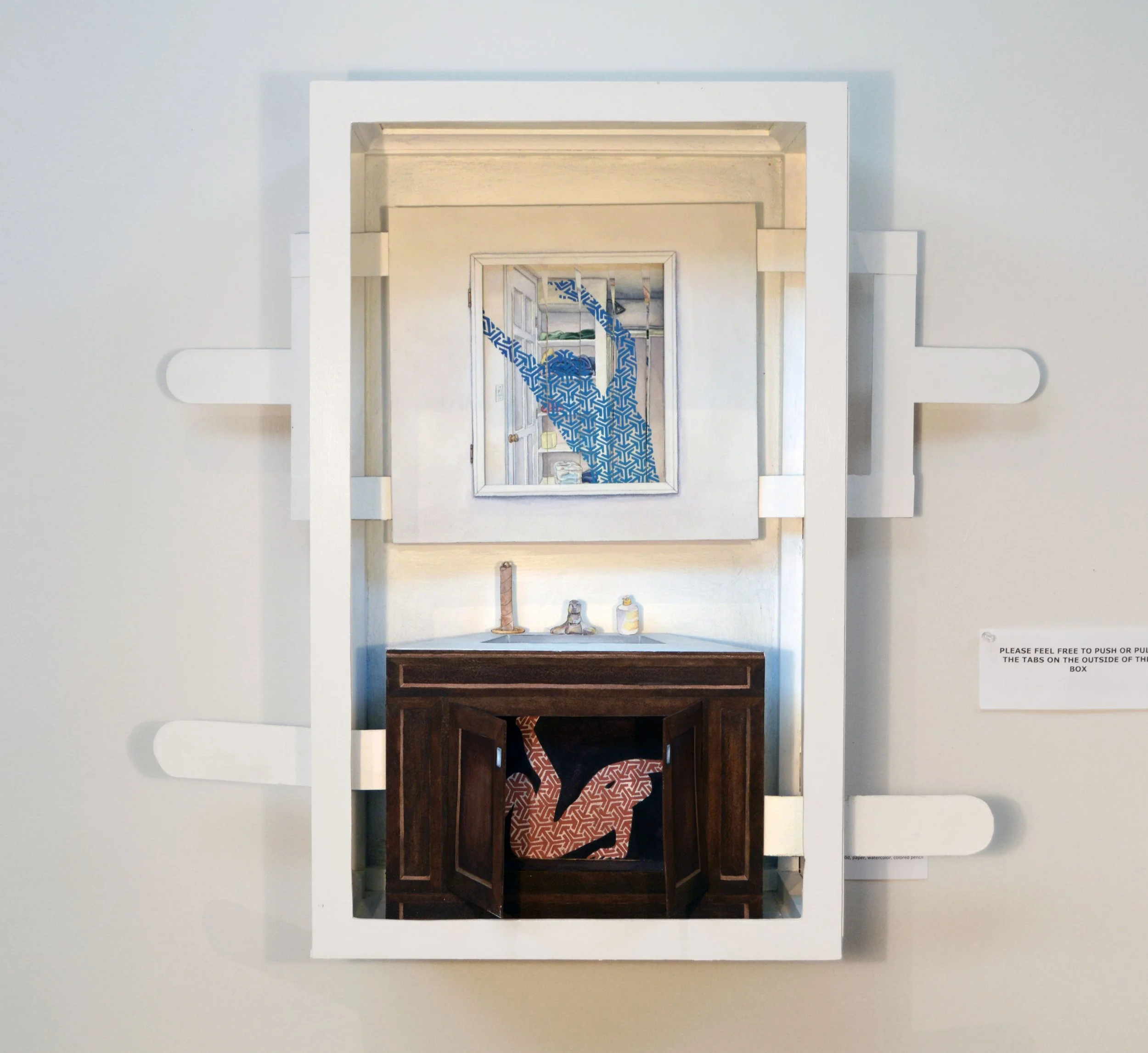 Cabinets is a movable drawing inspired by the mechanics and feeling of movable books. The two movable elements in the piece, the reflection in the mirror and the lower cabinet doors, are controlled by pushing and pulling the pull tabs on the outside of the box. Both of these features rely on the flexible qualities of paper to function. To support the movable features at a larger scale and on a wall rather than inside a book, they are incased in plywood structures which are covered in watercolor paper to maintain the internal consistency of the drawing.
